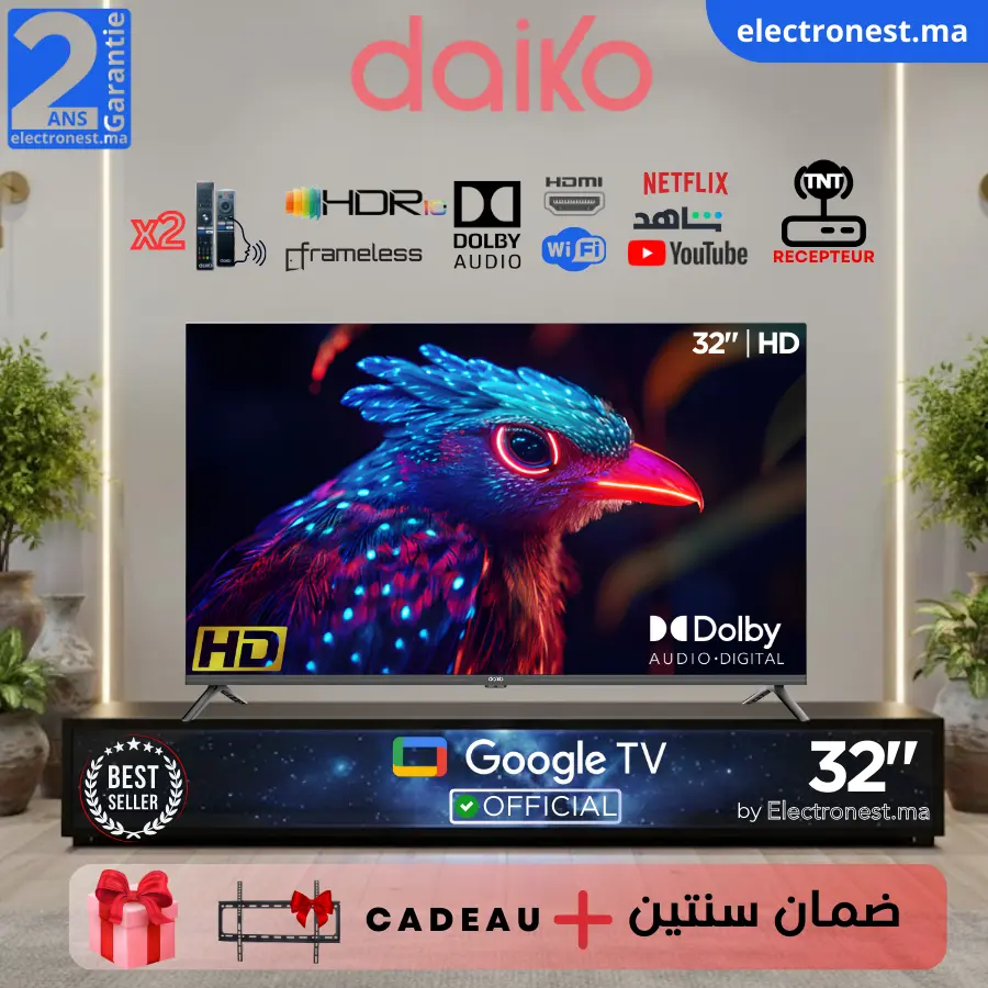Daiko 50"- Google TV 5.0– 4K UHD, HDR10, HLG, Dolby Audio - GLED50AI95DK Le prix initial était : 3200.00د.م..Le prix actuel est : 2989.00د.م..