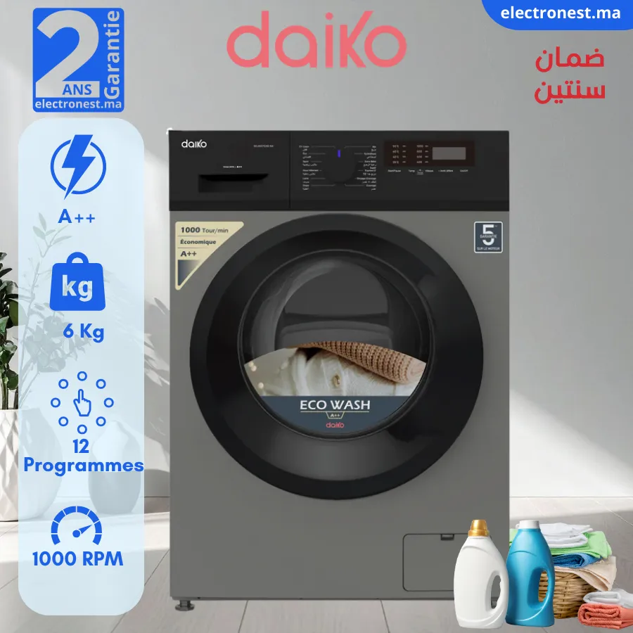 La machine à laver frontale Daiko WU657SX66K est la solution idéale pour les petits espaces grâce à son design Ultra-Slim de seulement 40 cm de profondeur. Avec une capacité de 6 kg, elle convient parfaitement aux personnes seules ou aux couples. Son écran LED assure une navigation simple et intuitive, tandis que sa classe énergétique A++ garantit une consommation électrique maîtrisée au quotidien.