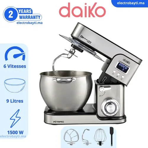 Découvrez le pétrin digital Daiko RP9764EDK, conçu pour simplifier vos préparations culinaires avec une puissance de 1500W et un grand bol en inox de 9 litres. Grâce à son écran digital, vous maîtrisez chaque étape de votre recette avec précision, tandis que ses 6 vitesses avec fonction Pulse assurent un mélange homogène et efficace.