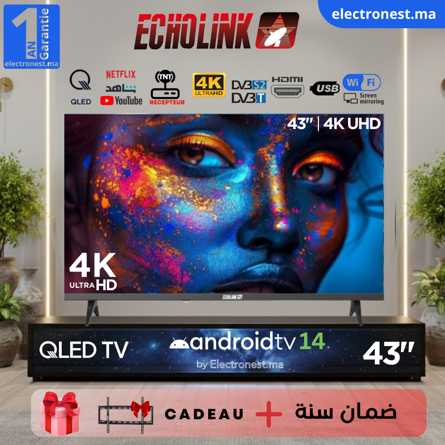 La Smart TV ECHOLINK est équipée d’une dalle QLED de grade A+, offrant des couleurs plus riches, des noirs plus profonds et une meilleure précision d’image que les écrans LED classiques. Avec sa résolution 4K UHD (3840 × 2160), elle garantit des images d’une netteté remarquable et d’un réalisme impressionnant, offrant une expérience immersive idéale pour les films, séries, jeux et contenus en ultra haute définition.