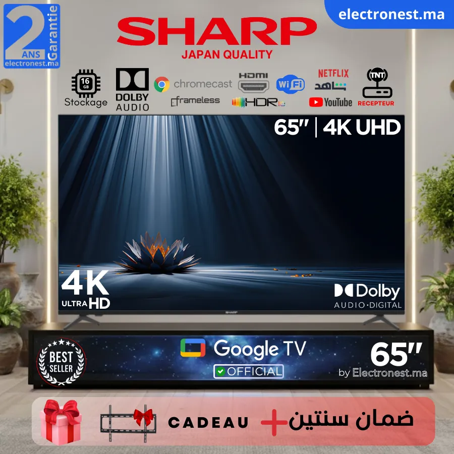 Avec son design slim et ses lignes épurées, la Smart TV Sharp 65″ s’intègre harmonieusement à tout intérieur. Son esthétique sobre et raffinée incarne parfaitement la qualité et la précision japonaises.