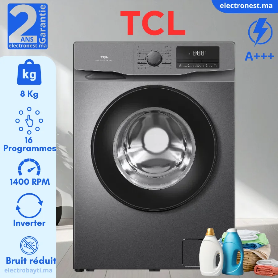 Découvrez le lave-linge frontal TCL P608FLG, alliant performance, technologie et soin du linge. Avec sa capacité de 8 kg, il répond parfaitement aux besoins des foyers modernes. Sa technologie Auto Wash ajuste automatiquement les paramètres selon la charge et le type de tissu pour un lavage optimal.